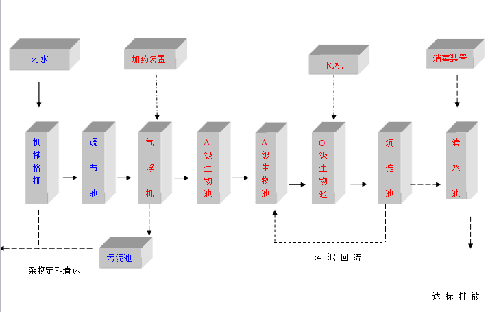 針對該項目具體污水水質(zhì)的特點,本方案擬采用常規(guī)的“氣浮機(加藥)+A/O/O生物接觸氧化+消毒設備”工藝,該處理工藝較為成熟,操作運行方便,日常費用低廉,出水穩(wěn)定,主要設備為鋼結(jié)構,考慮到周邊環(huán)境和衛(wèi)生問題,故該污水處理工程決定采用全埋地式結(jié)構,上部覆土,種植花木、草坪,進一步美化環(huán)境。